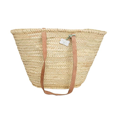 - Hand woven palm leaf basket with long leather handles.